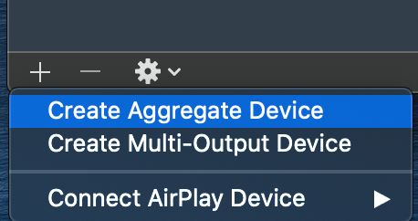 There, we’re going to create two new virtual devices. Click the + icon in the lower left and choose “Create Aggregate Device.” This virtual device will allow MacOS (and Core Audio) to recognize the inputs from each selected device as one virtual interface. Each devices input will be accessible simeltanuously. We’ll use this ability in Garageband later.