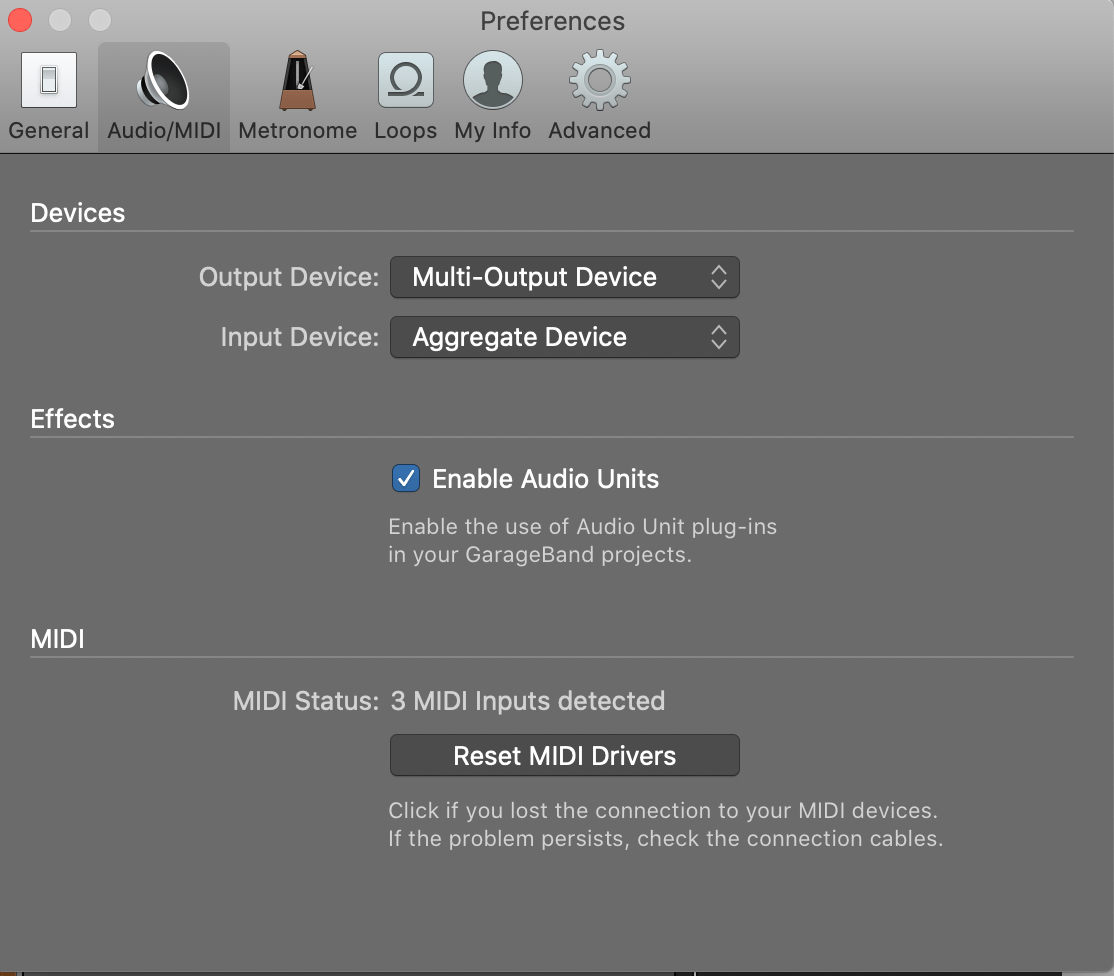 NOTE: There are two Soundflower devices, one with (2ch) and the other with (64ch). For the sake of your own sanity, be sure to use (2ch) in the Aggregate Device and (64ch) for the Multi-Output Device. If you do the opposite, Garageband will present you with over 60 different inputs to choose, making things much more complicated.