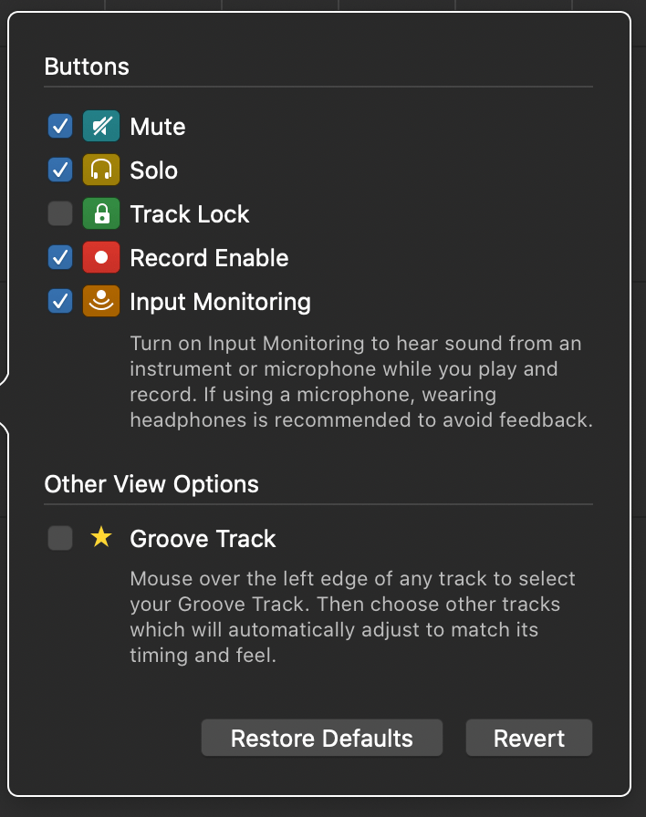 When this button is pressed, Garageband will route the sound from that track to both your headphones (so you can monitor the sounds) and to the “Soundflower (64ch)” output. You’ll need to record enable all of the tracks you wish to use in your Zoom session.