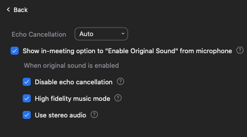 So there you have it! Great quality audio from your computer during a Zoom call. My students have reported that the music sounds great, and I can confirm that this is as good as it can get for audio over Zoom.