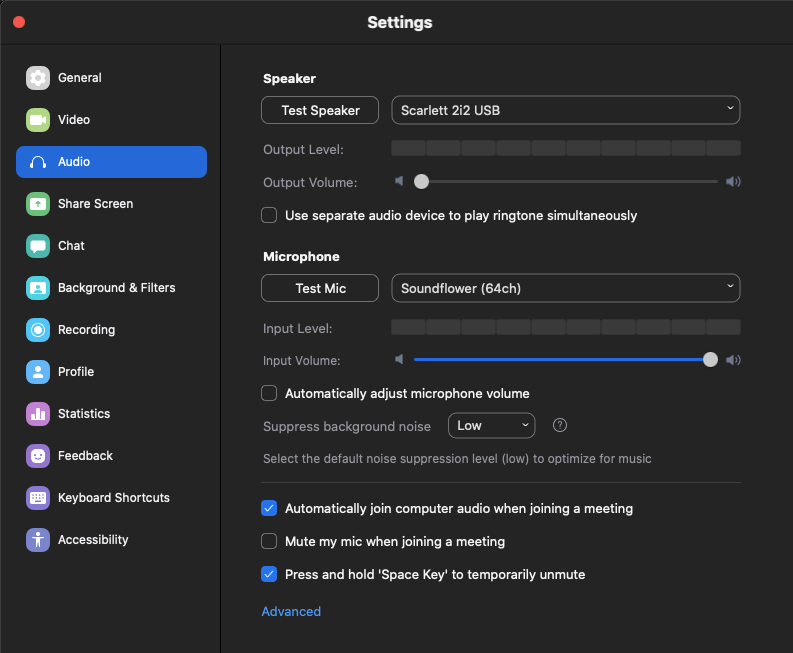 The last step is to set up Zoom. Luckily, this is the easiest part. In Zoom’s settings, head to the Audio menu. Select “Soundflower (64ch)” as the microphone and your monitoring device as the speaker. For me, that is my Scarlett 2i2.